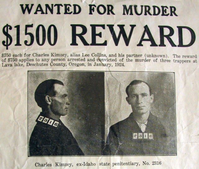 Kimzey was on the lam from the Idaho State Penitentiary, having escaped in 1915 while serving a 3 to 14 year stint for larceny. His many aliases included Lee Collins, Tom Collins, Bob Dales, Tom Rose, W.R. Howe and William Becker. He roamed throughout Montana, Idaho, Utah and eastern Oregon and in the early 1920s drifted into Deschutes County.